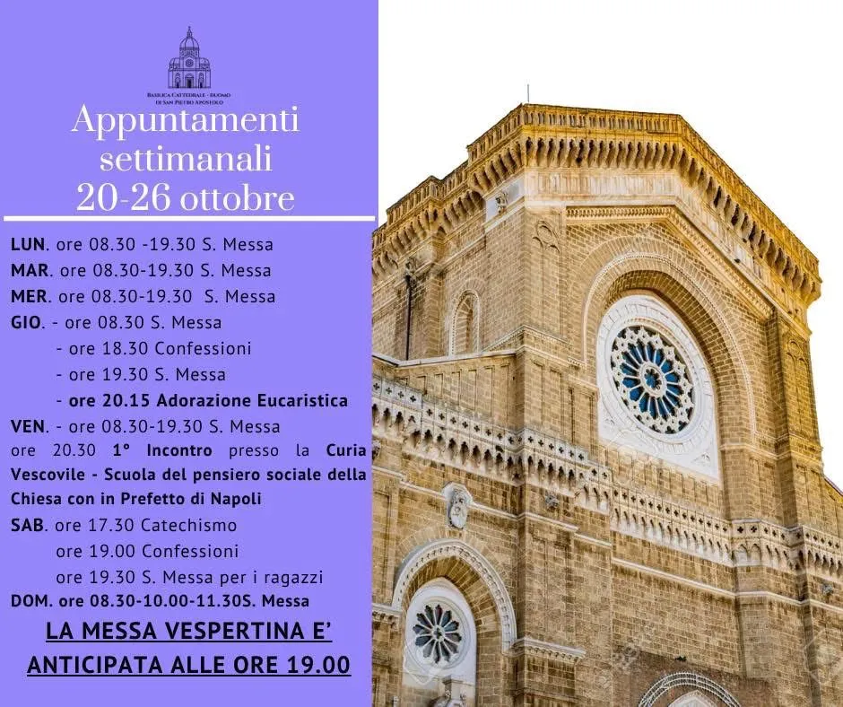 La comunità della Basilica Cattedrale di San Pietro Apostolo condivide il calendario degli appuntamenti liturgici e pastorali per la settimana dal 20 al 26 ottobre 2025. Un invito a partecipare con fede e spirito di comunione alle celebrazioni e ai momenti di preghiera.