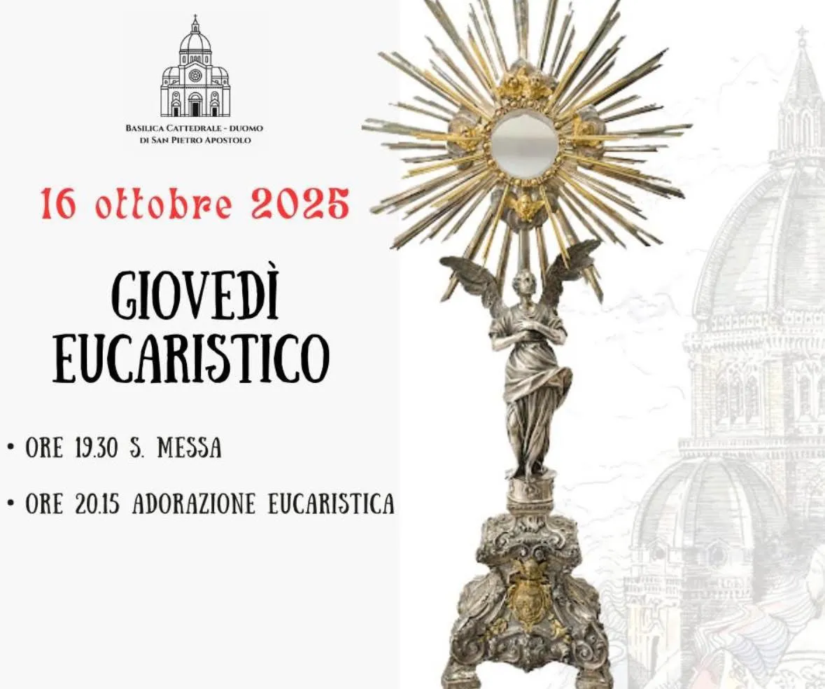 Un momento di profonda preghiera e adorazione ha riunito la comunità della Basilica Cattedrale di San Pietro Apostolo in occasione del Giovedì Eucaristico del 16 ottobre 2025. La serata è iniziata con la Santa Messa alle ore 19.30, seguita dall’Adorazione Eucaristica alle ore 20.15. Un appuntamento mensile di silenzio, meditazione e incontro con il Signore presente nell’Eucaristia, vissuto con fede e raccoglimento da tutta la comunità.